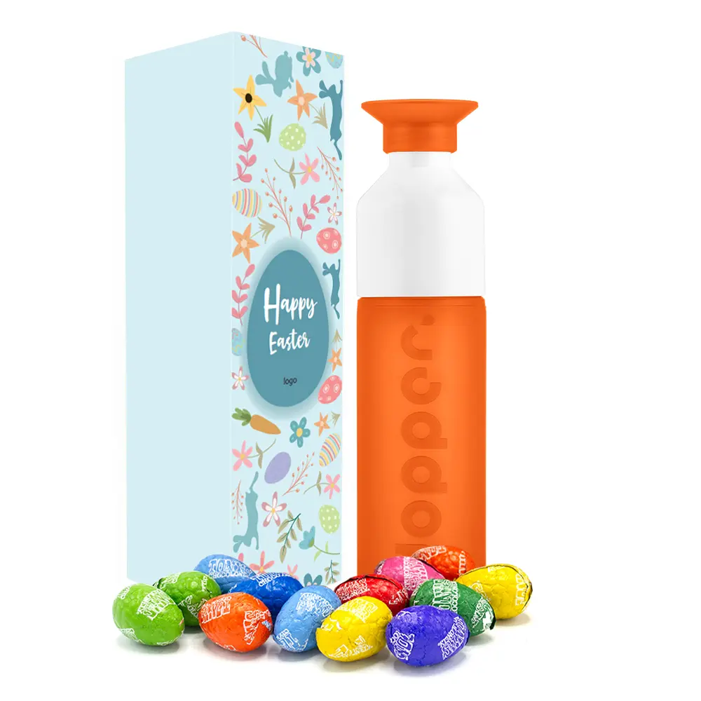 De onverminderd populaire Dopper is altijd goed om weg te geven. In ons paasassortiment hebben we ook twee prachtige geschenkpakketjes: het Dopper Original paasgeschenk met een chique zwart tasje. Daarnaast hebben we het Dopper paasgeschenk doosje, ook met de heerlijke paaseitjes van het bekende merk Tony's Chocolonely. De Dopper is dan verpakt in een gepersonaliseerd doosje.