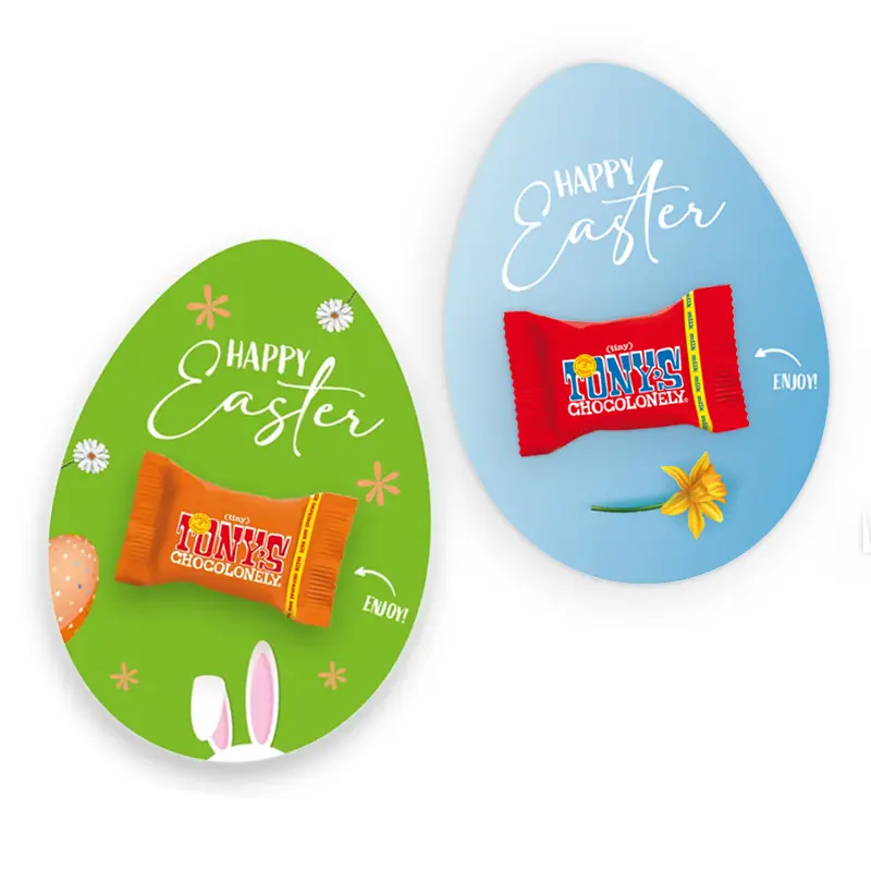 Op zoek naar een kaart met wat lekkers? Bekijk eens de paaskaart met Tiny Tony, het paasei met Tiny Tony of de kaart met een kleine Tony reep. De kaarten kun je helemaal volgens je eigen ontwerp laten bedrukken. Het is ook mogelijk om de kaarten individueel te laten versturen. Zo wordt het van A tot Z voor je geregeld!