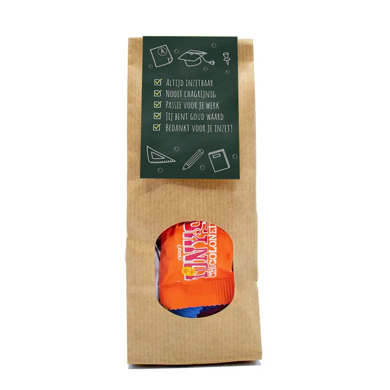 Het kaartje waarmee het zakje wordt afgesloten, kun je volledig personaliseren in full colour. Zet er een vrolijke boodschap op, een quote over onderwijs of gewoon: “Bedankt voor je inzet!” – want chocola zegt soms meer dan duizend woorden.