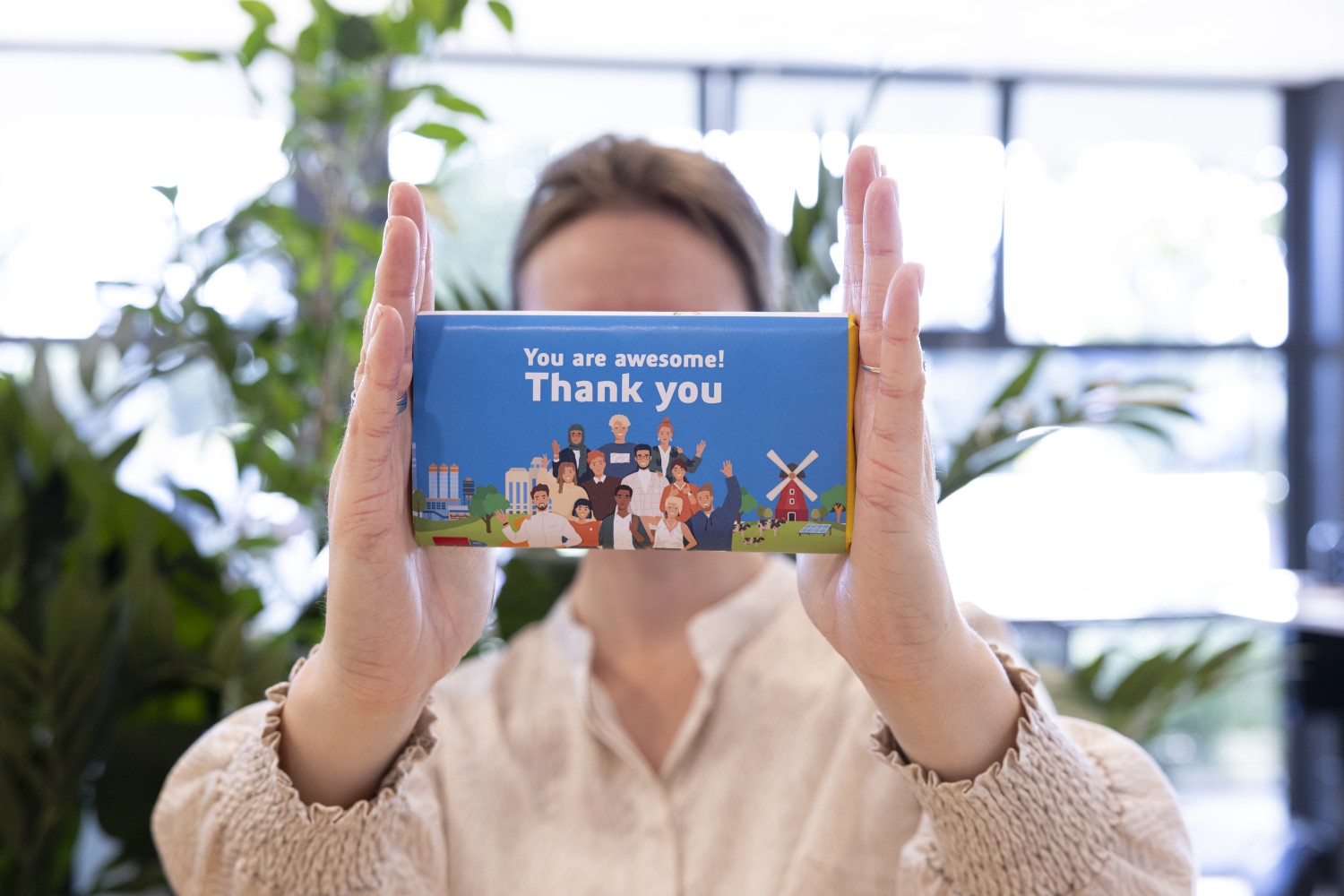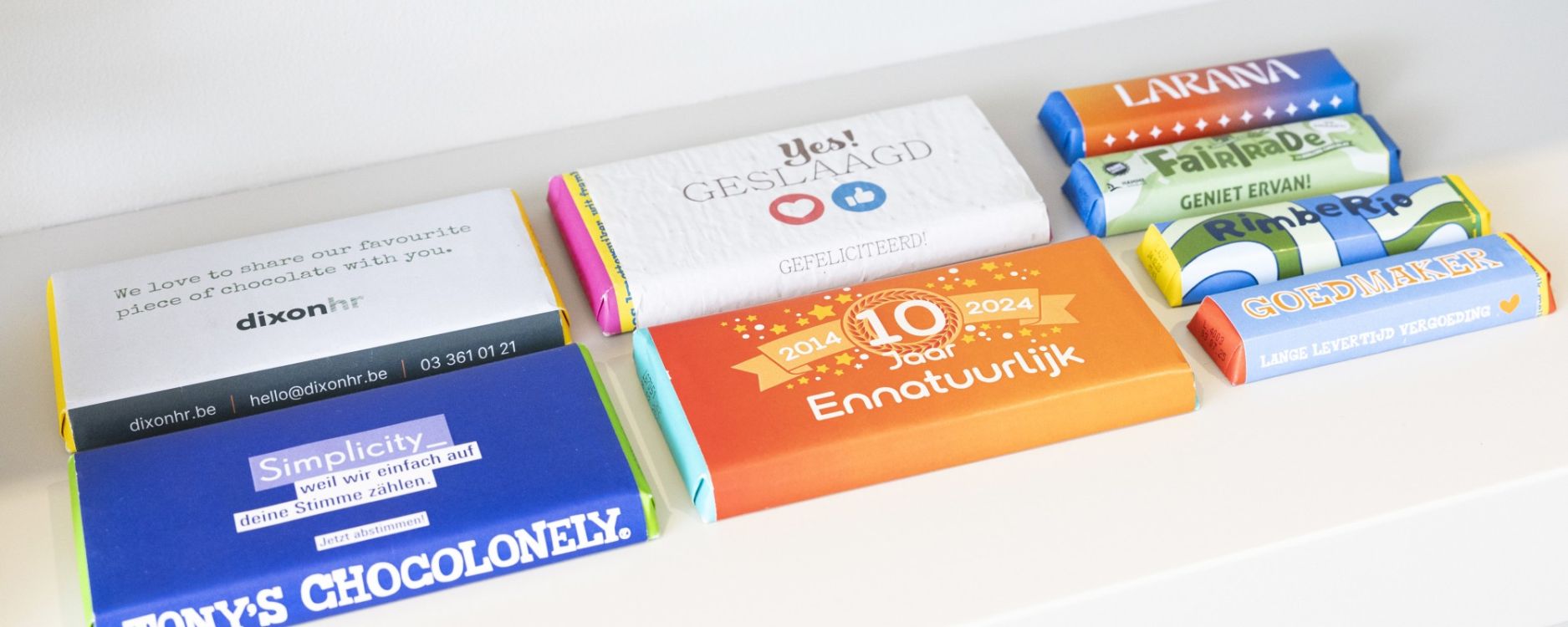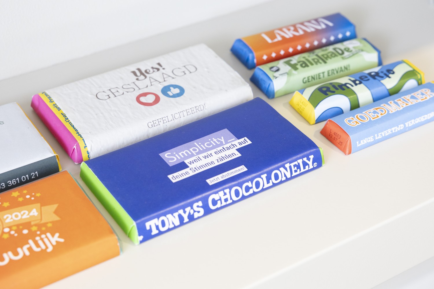 Chocola van Tony's Chocolonely is perfect als relatiegeschenk of bedankje voor je medewerkers. Welke boodschap je ook wilt vertellen, met de gepersonaliseerde wikkel is alles mogelijk. Als je een bestelling hebt geplaatst, ontvang je van ons een template. Deze kun je dan helemaal naar wens ontwerpen. De wikkel wordt full colour bedrukt, dus jouw boodschap valt zeker op.