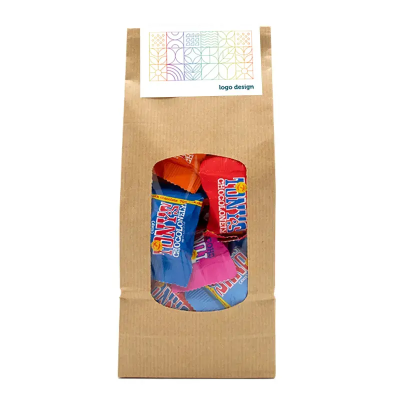 Hoe leuk is het om een zakje te geven met maar liefst 25 Tiny Tony's in verschillende smaken? Het kraft zakje wordt afgesloten met een kaartje die je full colour kunt laten bedrukken met je logo of eigen ontwerp.