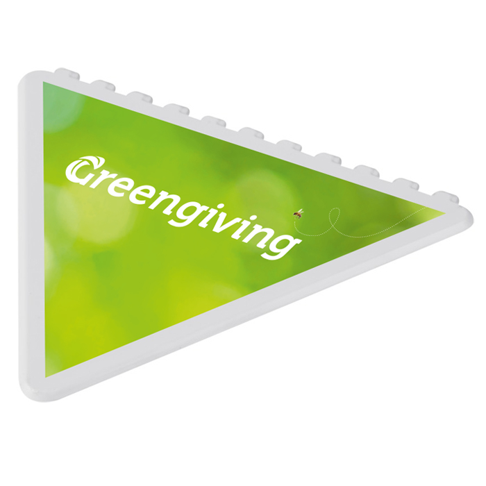 Op zoek naar een origineel én praktisch winters geschenk? Deze ijskrabber is perfect! Hij is gemaakt van gerecycled plastic en heeft een driehoekige vorm. Alledrie de zijden kunnen worden gebruikt om ijs weg te krabben. Je logo of ontwerp kan op de bovenkant full colour worden bedrukt. Voor de krabber zelf kun je kiezen uit 7 kleuren.