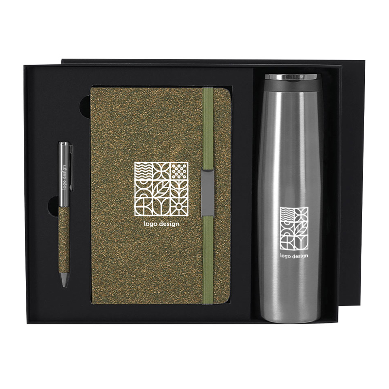 Laat je merk stralen met een bedrukking op het notitieboek, een gravering op de pen en een rondom bedrukking op de thermosfles. Een compleet relatiegeschenk waarmee je écht indruk maakt!